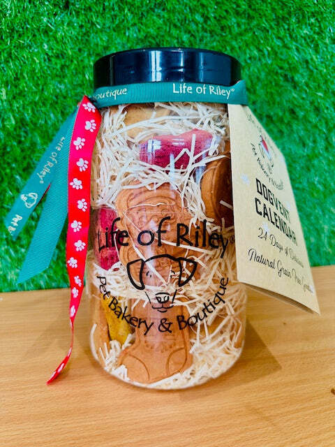 Riley's festive Dogvent Jar is packed with 24 days of natural festive biccies & some of their favourite everyday treats.