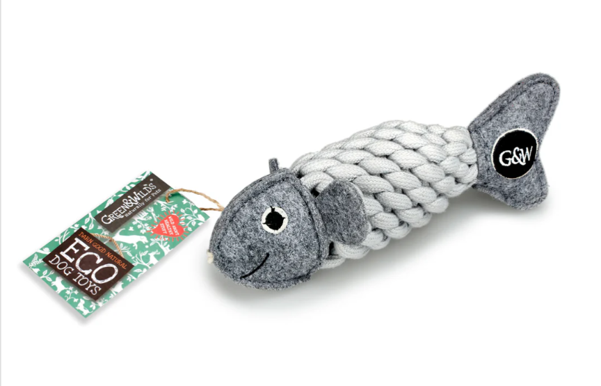 Don't get your flippers in a twist! Roger the Ropefish has fast become a best seller! In muted shades of grey, he is composed from a felt head, flippers and tail, with a recycled plastic bottle covered in braided jute rope. Jute is a natural, sustainable plant fibre. The suede used for his eye is a by-product and ensures that this material is not wasted. Tough and long lasting, made without using any compound that would harm or be released when chewed. Jute is 100% biodegradable.